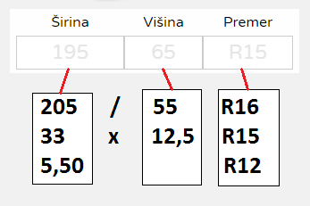 Večina pnevmatik ima med širno in višino ločilo poševnico / (195/65 R15).Če ima pnevmatika za ločilo znak x (33x10,50 R15) se izpolnijo polja enako kot pri /.